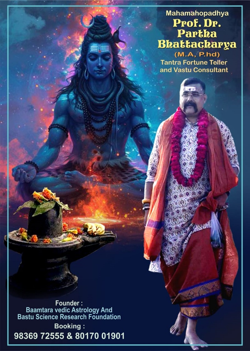 Mahamahopadhyay Dr. Partha Bhattacharya is a distinguished Tantrik and astrologer based in Howrah, West Bengal. With over 30 years of experience, he has earned a reputation for his profound knowledge in Vedic astrology, Tantra, palmistry, Vastu Shastra, and ritualistic practices like Rudraksha and Yantra Puja. His guidance has been instrumental for individuals seeking clarity in personal, professional, and spiritual matters.