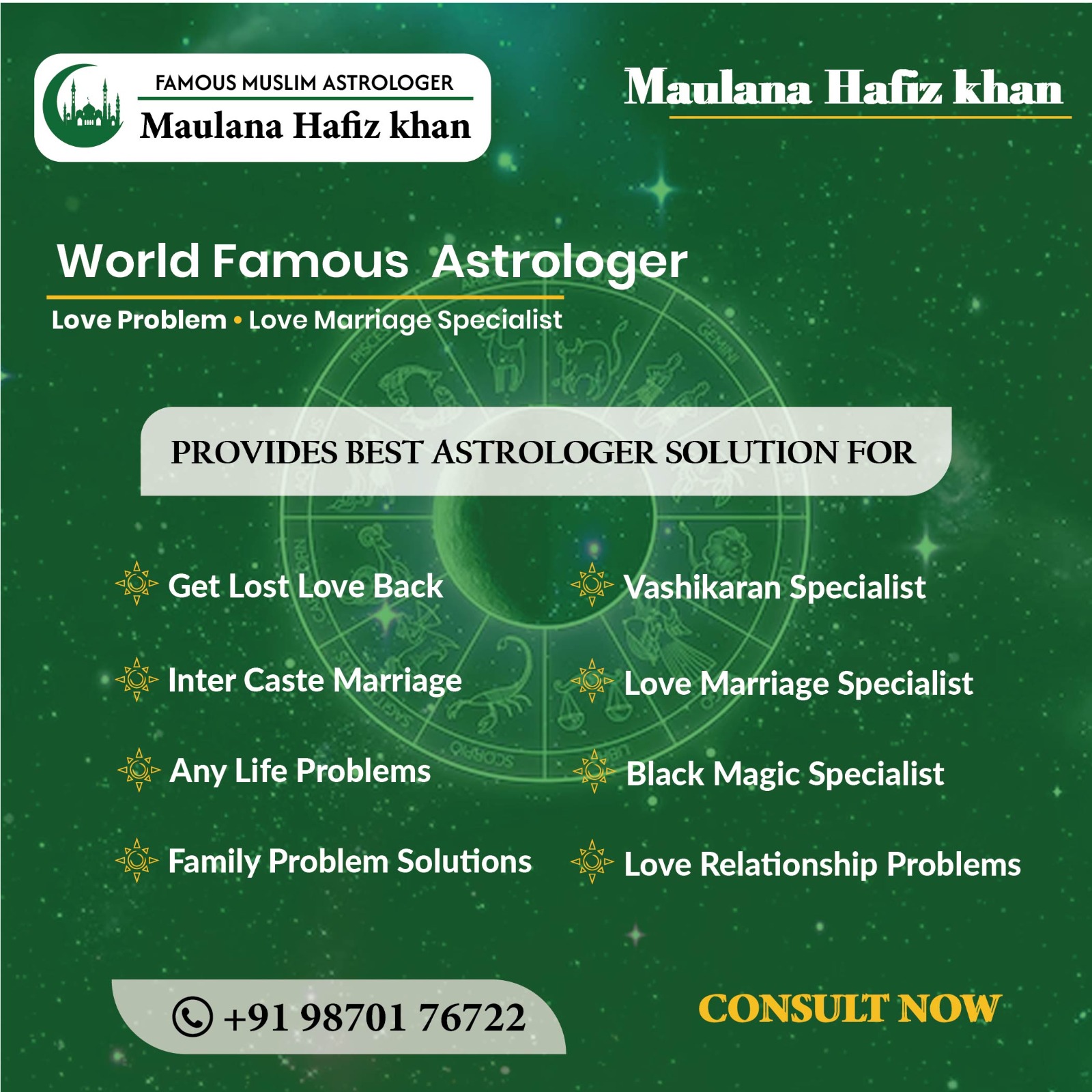 Why choose Maulana Hafiz Khan: Truly a guide, a friend and a well wisher Maulana Hafiz Khan ensures the happiness of each one knocking his door for help. His good heart and passion to solve problem makes him listen to the minute details of the unique situation that you are passion. Then he crafts out the magic solution for the situation that makes him the Top Astrologer Mauling Hafiz khan not only in Dubai but around the world.